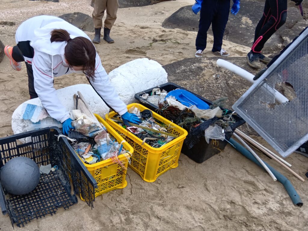 今回の行程では荒天の影響により海底ごみの回収作業は実施できませんでしたが、過去に回収されたごみの洗浄・分別作業および海岸における清掃活動を、総勢18名にて実施いたしました。