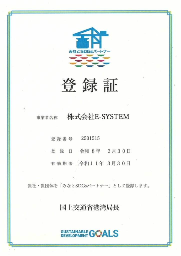本制度は、港湾関連企業におけるSDGsの取り組みを促進し、その活動を「見える化」することを目的として創設されたものです。弊社株式会社E-SYSTEMは第15回登録者として、登録者一覧に掲載されています。